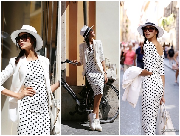 | Những ngày có mặt tại London tham gia show diễn thuộc Tuần lễ thời trang xuân hè 2015, Hoàng Thùy tranh thủ ghi lại hình ảnh mới trên đường phố tấp nập của kinh đô thời trang thế giới. Trong ảnh, cô diện bộ cánh đồng gam trắng thanh lịch. Thiết kế chấm bi ôm dáng hợp xu hướng mix hài hòa cùng vest và giày đế bệt tiện lợi. |