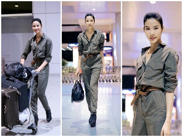 | Đáp chuyến bay trở về Việt Nam sau hơn một tháng công tác tại Anh, quán quân Next Top Model mùa thứ 2 chọn phong cách quân đội mạnh mẽ. Bộ trang phục tông màu xanh lục mix ăn ý cùng boots hầm hố, thắt lưng làm điểm nhấn cá tính. |