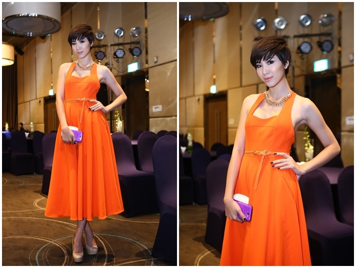 Trang phục có kiểu dáng nữ tính, tông màu cam nổi bật giúp người mẫu cá tính Huỳnh Nu nền nã và duyên dáng hơn. Ảnh: Khoa Nguyễn