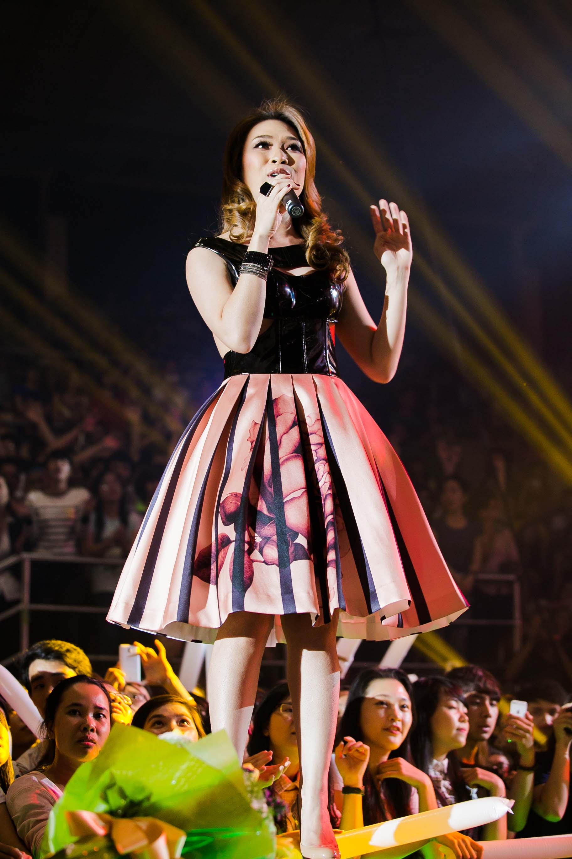 Sau những ồn ào về nghi án đạo nhái thiết kế, ''họa mi tóc nâu'' ghi điểm phong cách với bộ cánh phù hợp vóc dáng và hình tượng nữ tính. Lần này, nữ ca sĩ diện bộ đầm xếp ly duyên dáng, phối cùng áo chất liệu da hiện đại tạo hình ảnh đẹp mắt. Cô nhận được nhiều lời khen khi xuất hiện duyên dáng trong liveshow Dấu ấn của Hiền Thục. Ảnh: An Trần