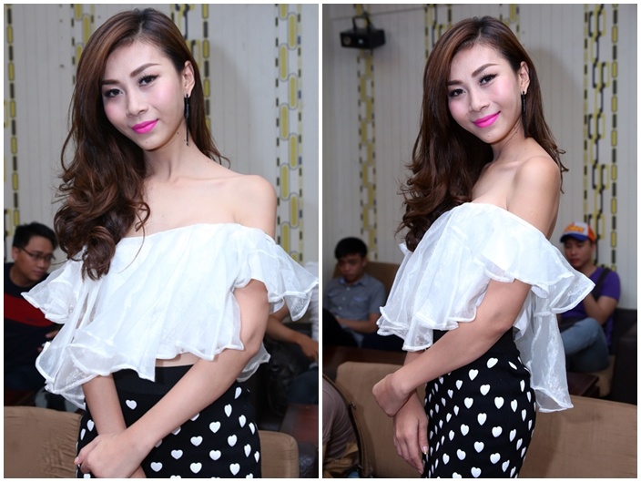 Lan Phương Next Top Model cũng có mặt trong danh sách sao đẹp tuần này nhờ bộ trang phục nữ tính hợp vóc dáng. Chiếc áo voan diềm bèo kết hợp với chân váy bút chì chấm bi toát lên hình ảnh cổ điển. Ảnh: Maison de Bil