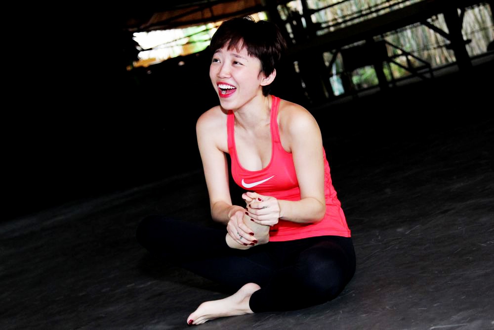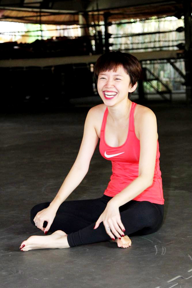 | Nụ cười sảng khoái của nữ ca sĩ trên sàn tập võ. |