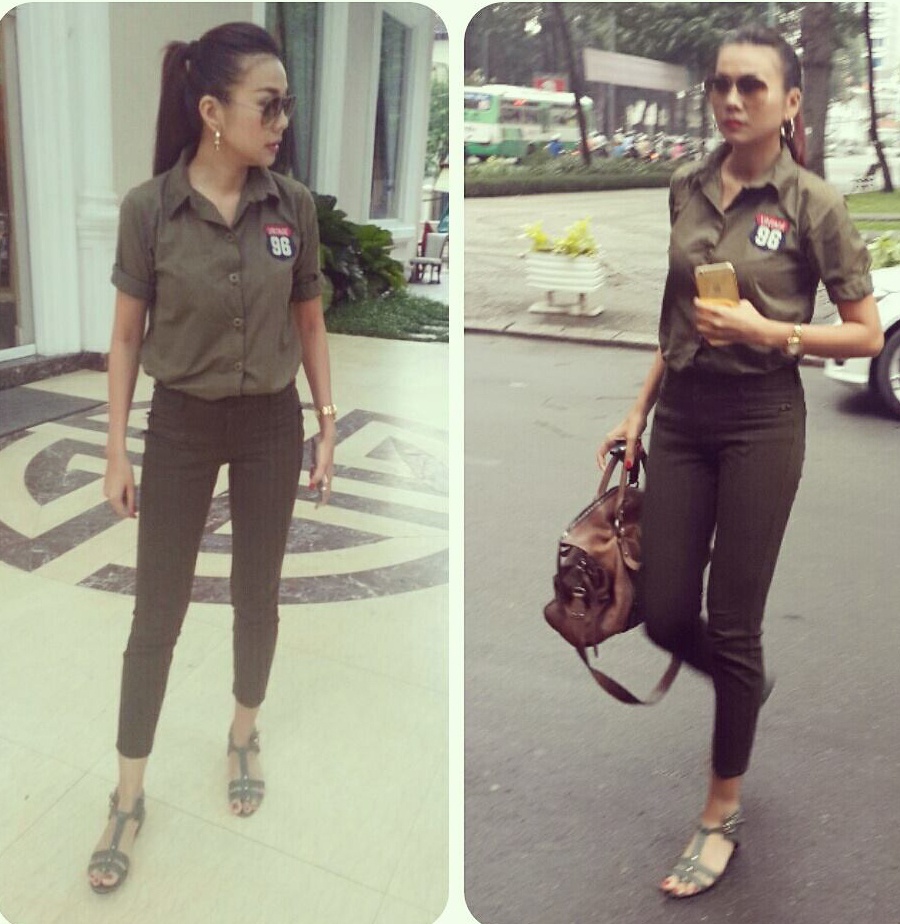 | Siêu mẫu Thanh Hằng nổi bật nhất tuần qua với thời trang đời thường đầy cá tính và mạnh mẽ. Cựu giám khảo Vietnam's Next Top Model diện trang phục phong cách quân đội, quần tối màu và sandals hợp mốt. |
