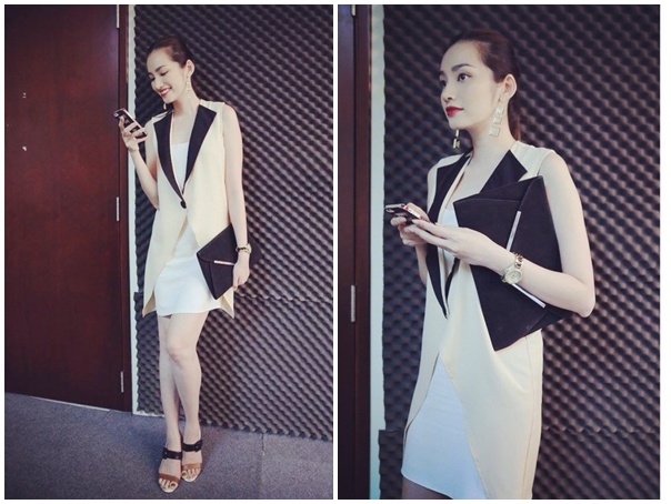 | Hoa hậu Thời trang Trúc Diễm gây chú ý trên phố với bộ trang phục gam trắng thanh lịch. Áo vest tay trần mix ăn ý cùng đầm suông mềm mại. |