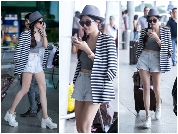 | Bộ trang phục short ngắn hiện đại, đi cùng áo vest sọc kẻ và áo thun crop-top giúp Trang Pháp ghi điểm cộng về phong cách thời trang đời thường nhanh nhạy xu hướng. |