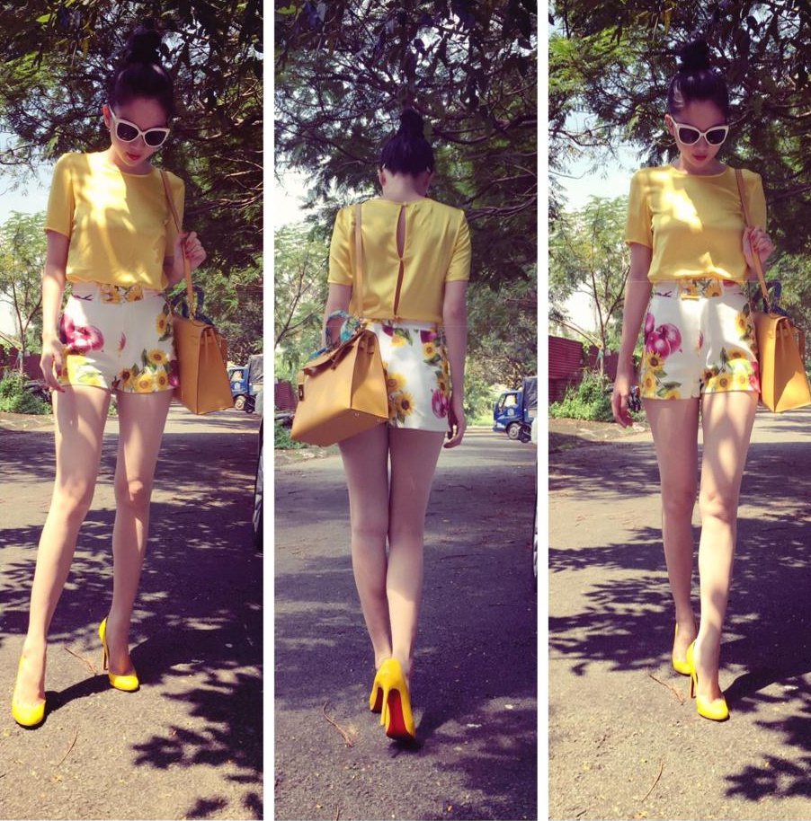 | "Nữ hoàng nội y" Ngọc Trinh gây chú ý với bộ cánh gam màu vàng đồng điệu. Quần họa tiết hoa nhã nhặn mix hợp tông cùng tổng thể có gam màu bắt nhịp xu hướng. |