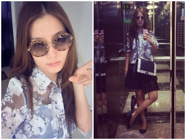 | Diễm My 9X tinh nghịch khi khoe phong cách thời trang hợp mốt, áo sơ-mi in hoa phối cùng chân váy da hiện đại. Phụ kiện túi Chanel đi kèm ăn ý về sắc độ. |