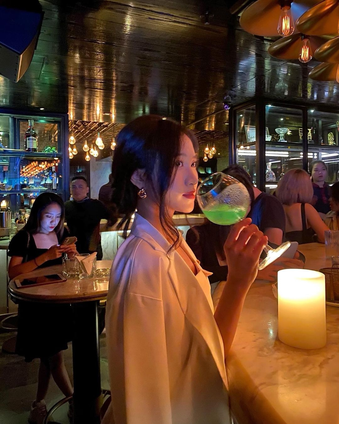 Tú Uyên: "Không gian quán sang trọng, cổ điển nhưng vẫn thoải mái dù đi theo nhóm hay đi một mình. Tầng 2 của quán có không gian riêng cho các cặp đôi hẹn hò. Cocktail ở đây không chê được gì, mix đủ vị. Các bạn phục vụ đáng yêu và tinh tế".