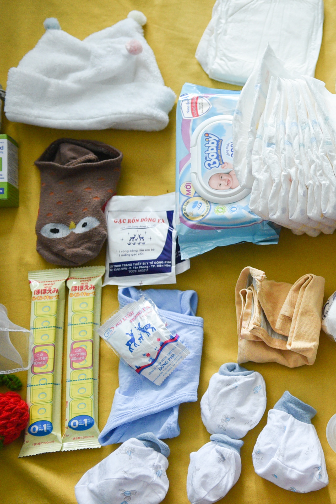 | Đồ đạc chuẩn bị đi sinh gồm rất nhiều thứ: quần áo, bỉm tã, sữa viên, máy vắt sữa,… Sợ bị nhầm lẫn hoặc mang thiếu đồ, tôi bày mọi thứ ra giường, kiểm tra lại thật kỹ lưỡng rồi chia làm các túi nhỏ. |