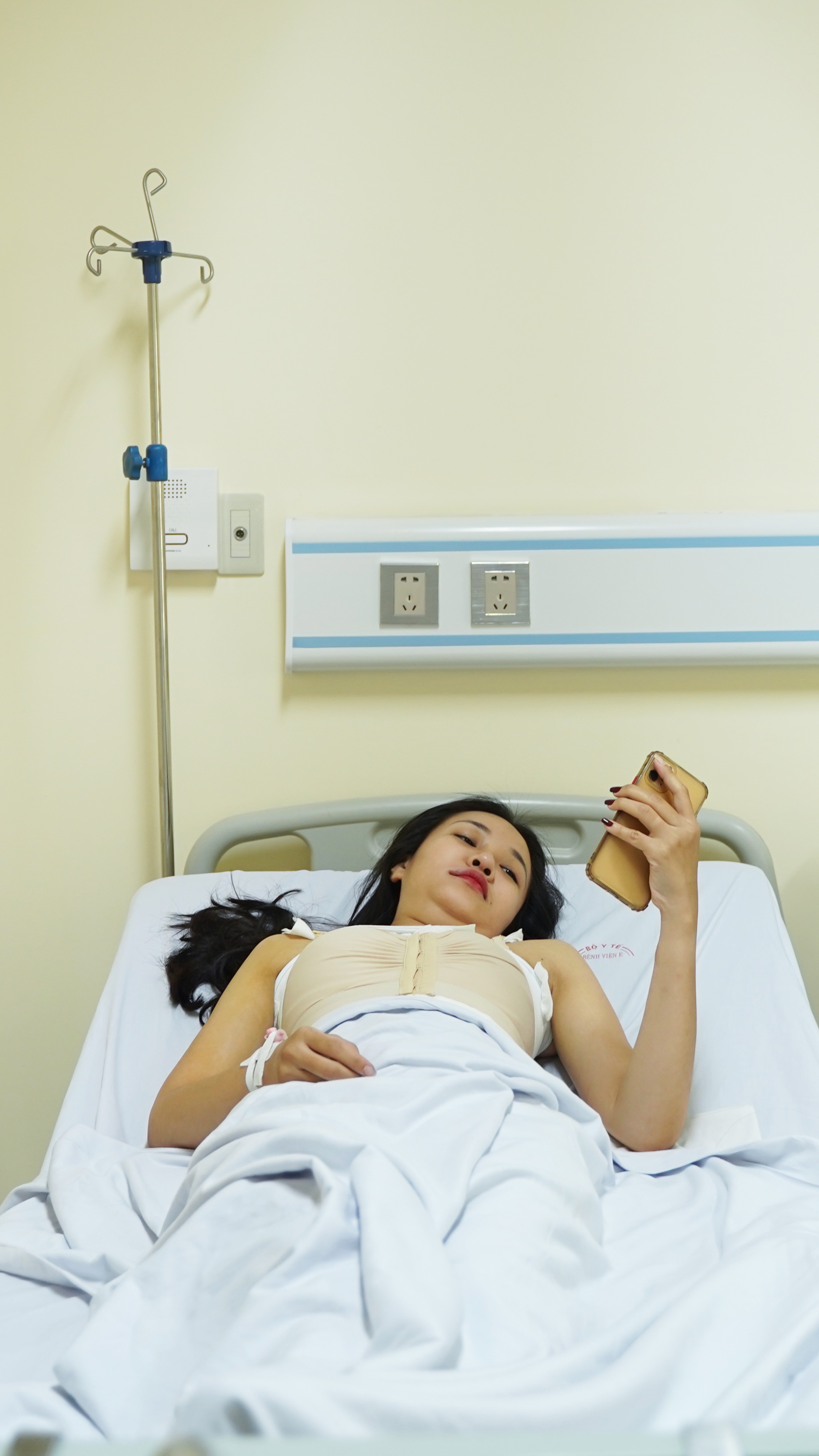 | Tôi không thể tự đi lại cũng như chống tay, mọi sinh hoạt đều có các điều dưỡng của khoa hỗ trợ. Tuy có chút nặng nề và lạ lẫm nhưng nhìn thấy vòng một căng tràn khiến tôi cảm thấy tự tin hơn rất nhiều. |