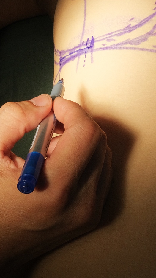 | 6h sáng hôm sau tôi có mặt ở bệnh viện để thay đồ, cất tư trang, vẽ lại đường trên ngực để định hình vị trí đặt túi rồi di chuyển tới phòng mổ. |