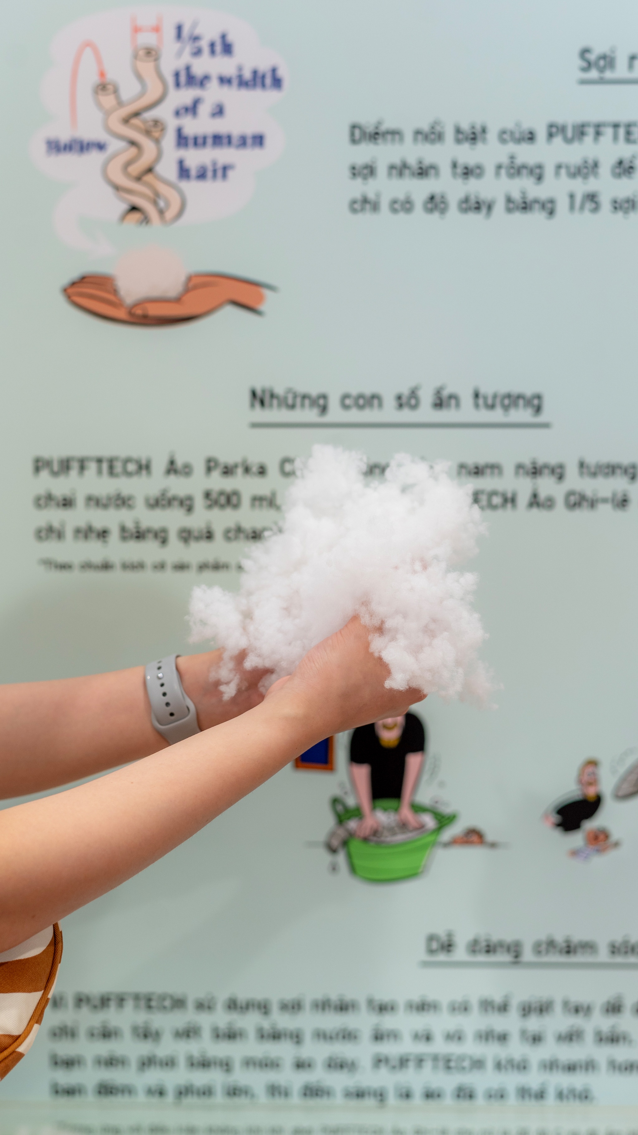 | Sợi nhân tạo rỗng ruột trong áo có độ dày chỉ bằng 1/5 sợi tóc người. Thêm vào đó, cấu trúc 3D dạng xoắn đàn hồi như lò xo còn giúp tăng hiệu suất cách nhiệt. Đặc biệt, dòng Pufftech nam chỉ nhẹ bằng chai nước 500 ml. Dòng Pufftech nữ thậm chí chỉ nhẹ bằng quả chanh. |