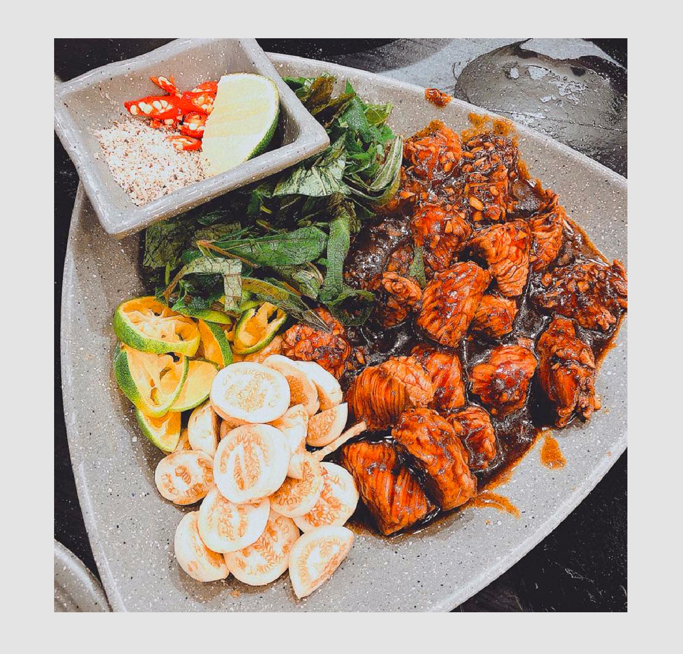 Món tôi ấn tượng nhất là thịt bò xay nhuyễn ăn kèm nước mắm chua ngọt của Việt Nam. Món ăn có sự kết hợp ẩm thực Đông - Tây. Phần nước mắm được xử lý để cô đặc lại, khi ăn, tôi chỉ cần quết lớp nước mắm lên thịt xay là được.