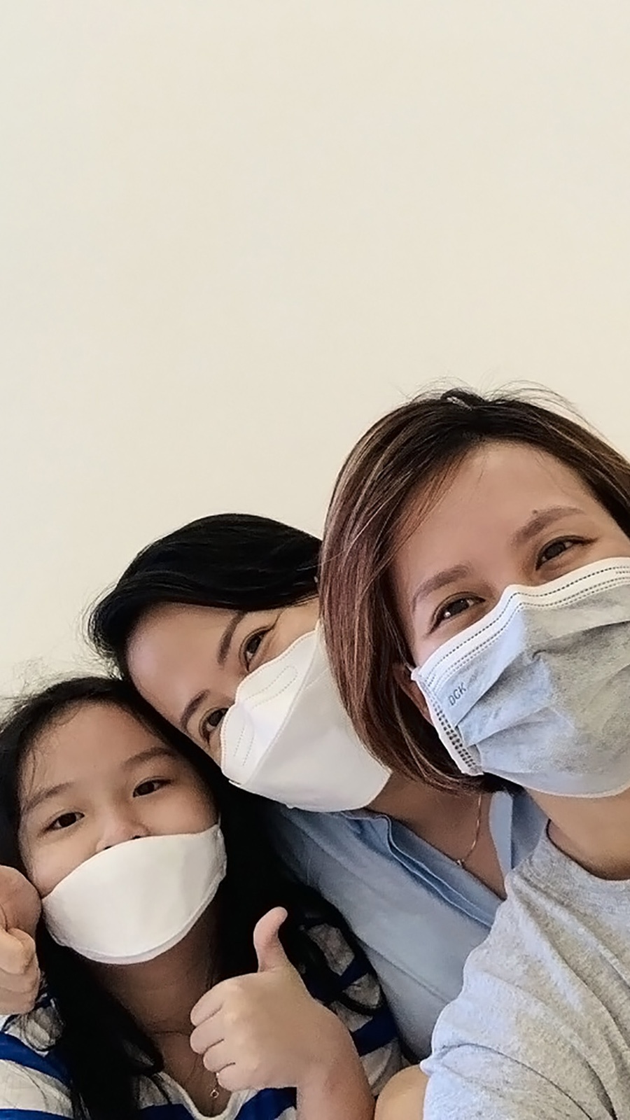 | Trước đó vài giờ, tôi quây quần vui vẻ bên mẹ, chị và em gái út ở nhà. Mọi người ủng hộ tinh thần tôi, với thông điệp "tiêm vaccine để khỏe mạnh phòng dịch Covid-19". Vì thế, tâm lý tôi khá thoải mái. |
