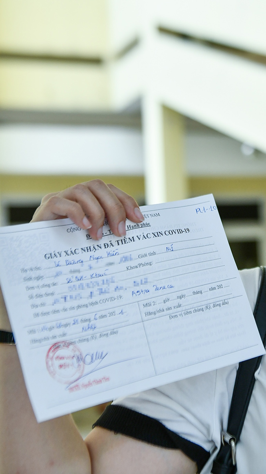 | Tôi được nhân viên y tế đưa giấy xác nhận đã tiêm vaccine Covid-19. Bản thân cảm thấy vui và rất may mắn khi được tiêm phòng Covid-19. Bởi lượng vaccine nhập có được trong đợt này vẫn khá ít so với dân số hàng triệu người của thành phố. |