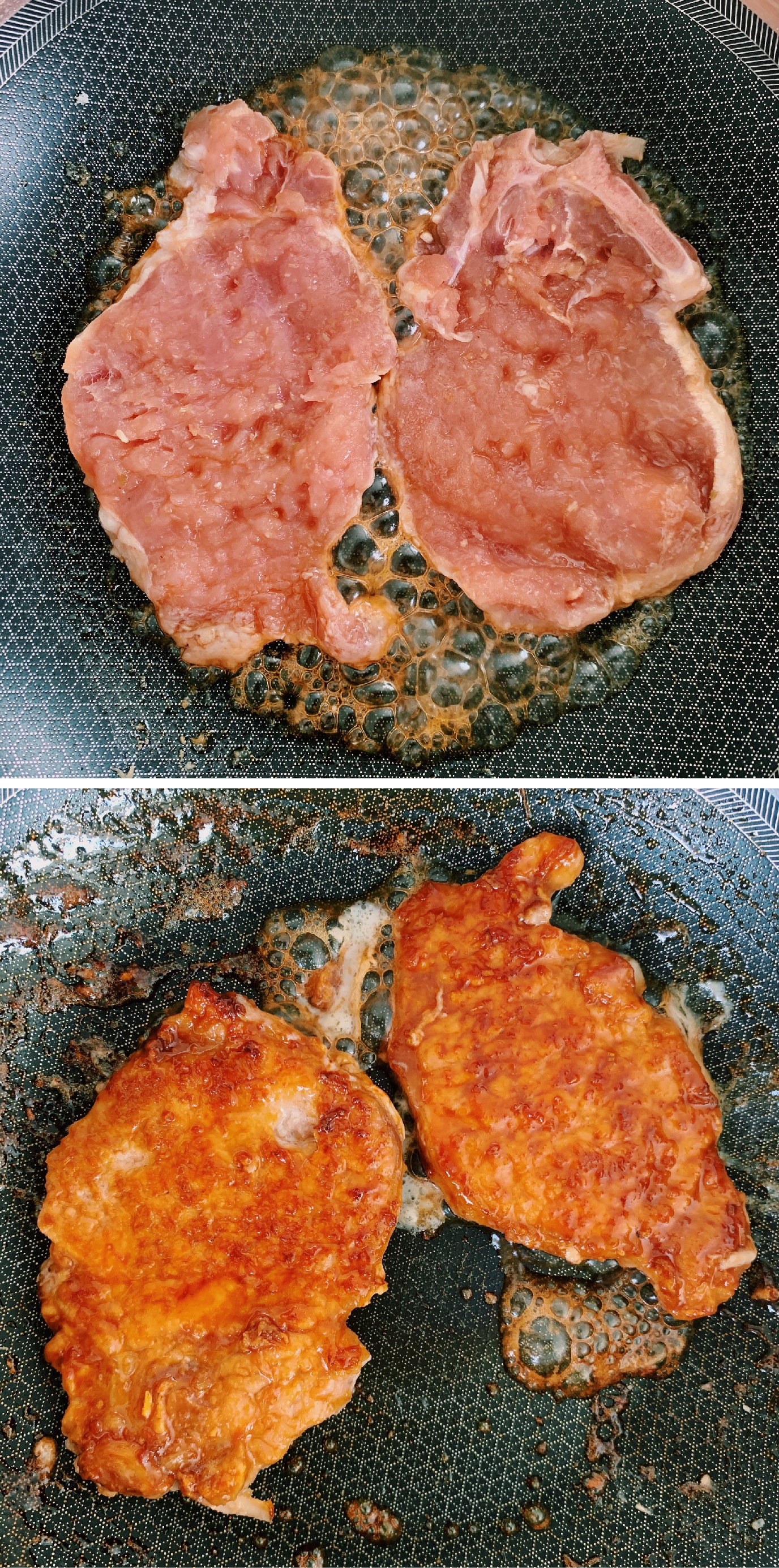 Kỹ thuật áp chảo rất đơn giản. Bạn chỉ cần để miếng cốt lết vào chảo nóng cho đến khi vàng đều 2 mặt là xong. Bí quyết của tôi là hãy thắng một chút đường, chờ đường chuyển màu cánh gián, thêm vào một chút nước, sau đó áp chảo thịt. Miếng cốt lết sẽ có màu rất đẹp mắt và hấp dẫn hơn.