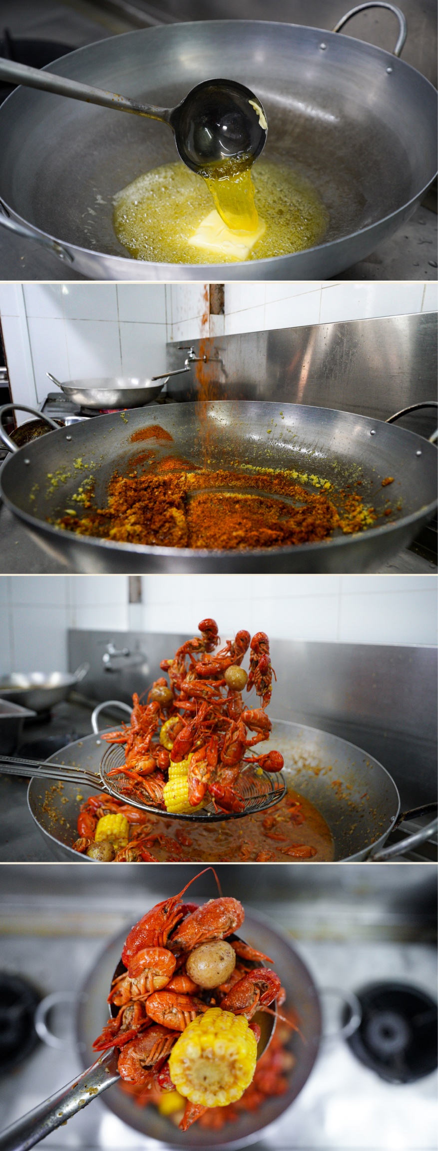 Bơ được cho vào chảo đầu tiên. Người nấu ăn bật bếp, đợi bơ tan 70-80% thì thêm tỏi, đảo đều trong 5 phút. Khi hỗn hợp tỏa mùi thơm, đầu bếp cho bột cajun, cam tươi là hoàn thành khâu làm sốt. Phần sốt nên được nêm nếm đậm đà, tránh trường hợp món ăn nhạt khi kết hợp cùng tôm hùm và các nguyên liệu khác.