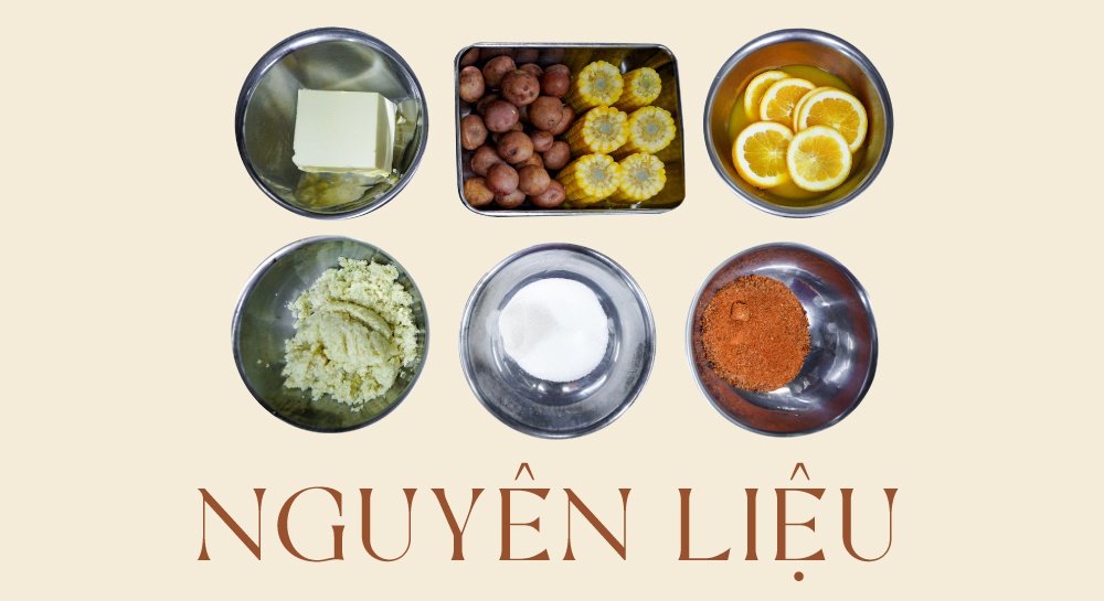Trong 5 phút để ráo tôm, anh Thạch quay sang khu vực sơ chế nguyên liệu ăn kèm. Anh rửa khoai tây, cắt bắp thành khúc 5-6 cm, cùng với tỏi băm, bơ sốt cajun, cam tươi đặt trong các tô riêng tươm tất.