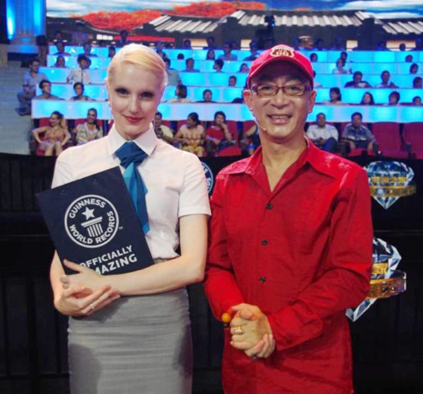 | Lục Tiểu Linh Đồng chụp hình kỷ niệm cùng đại diện Sách Kỷ lục Guinness. |