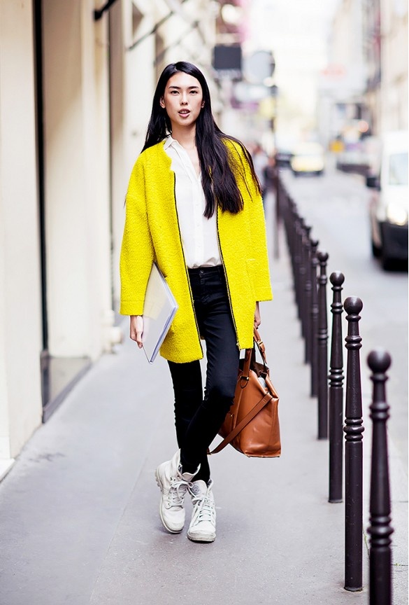 | Gợi ý khỏe khoắn với áo khoác dạ vàng rực kết hợp giày sneakers. |