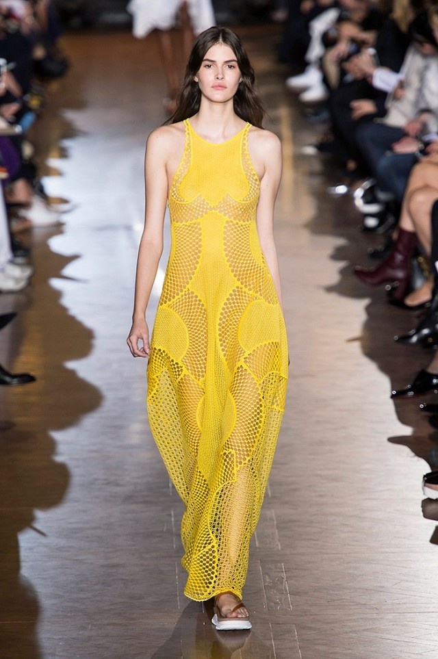 Stella McCartney mang tới xu hướng mát mẻ với đầm ren lưới kết hợp tông vàng hợp mốt. |