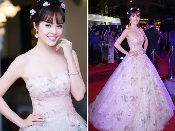 | Tham gia sự kiện tại TP HCM, Trương Thị May chọn bộ đầm tông vàng phom bồng xòe cổ điển. Thiết kế phom cúp ngực khoe vai trần. Tông trang điểm hợp màu da và kiểu tóc rẽ ngôi ăn nhập tổng thể. Ảnh: Maison de Bill |