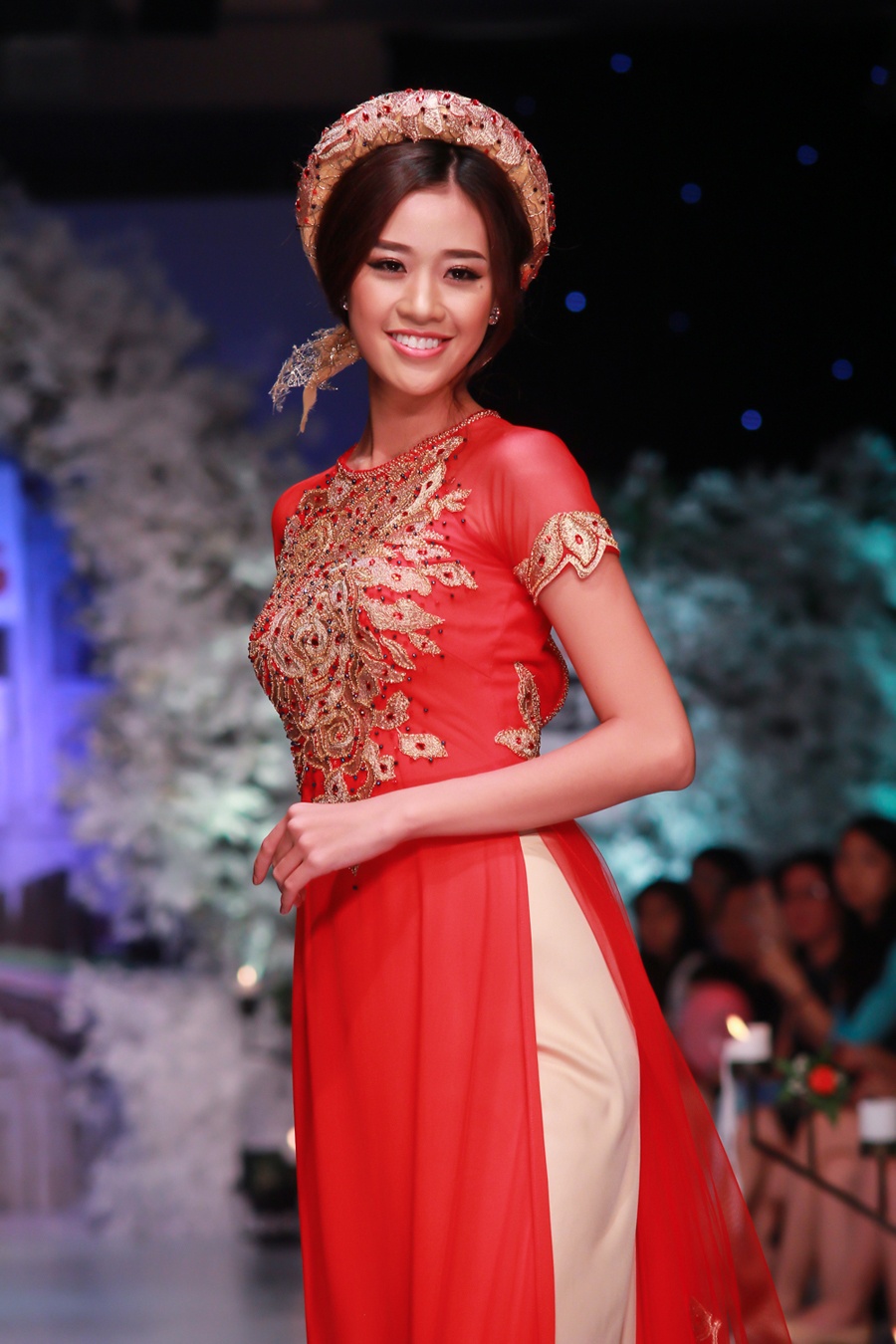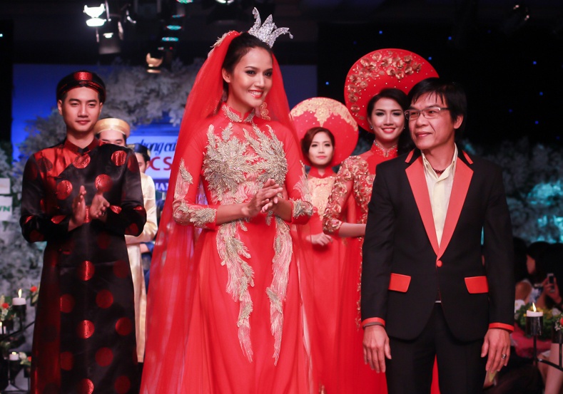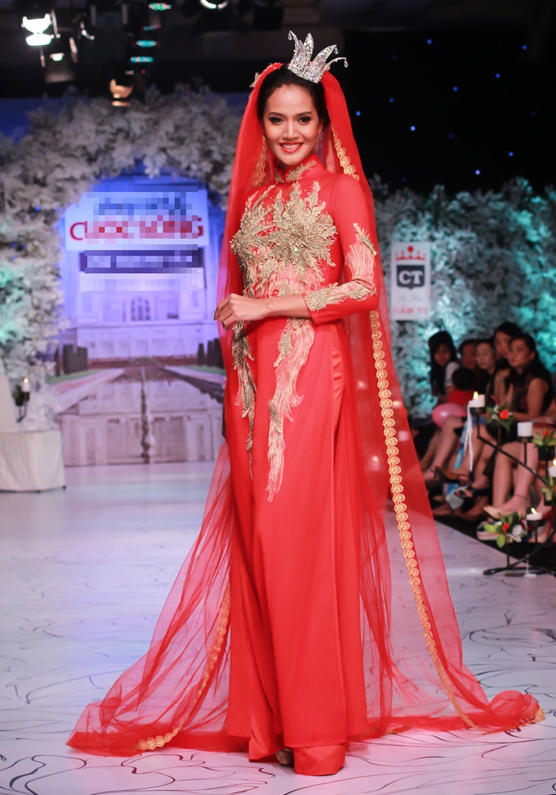 | Khánh Vân, top 10 Hoa hậu Hoàn vũ Việt Nam 2015 vừa tham gia trình diễn bộ sưu tập áo dài cưới của NTK Cẩm Tú, trong chương trình Phong cách & Cuộc sống, tối 20/10, tại TP HCM. Trên sàn diễn thời trang định kỳ, người đẹp thể hiện thiết kế tông màu đỏ, thêu hoạ tiết cầu kỳ ở thân trước. |