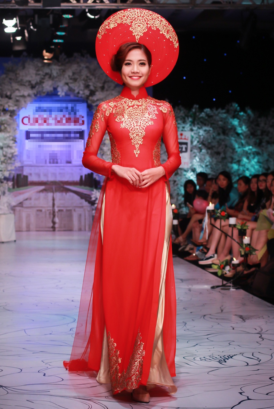 | Nhà thiết kế Cẩm Tú cùng vedette Quanh Đi chào chốt màn show diễn. |