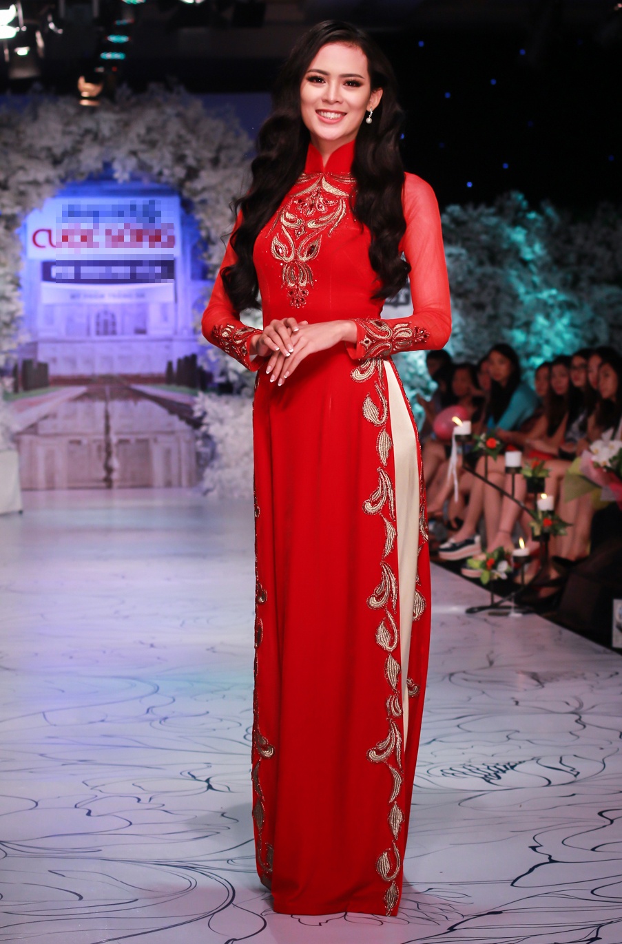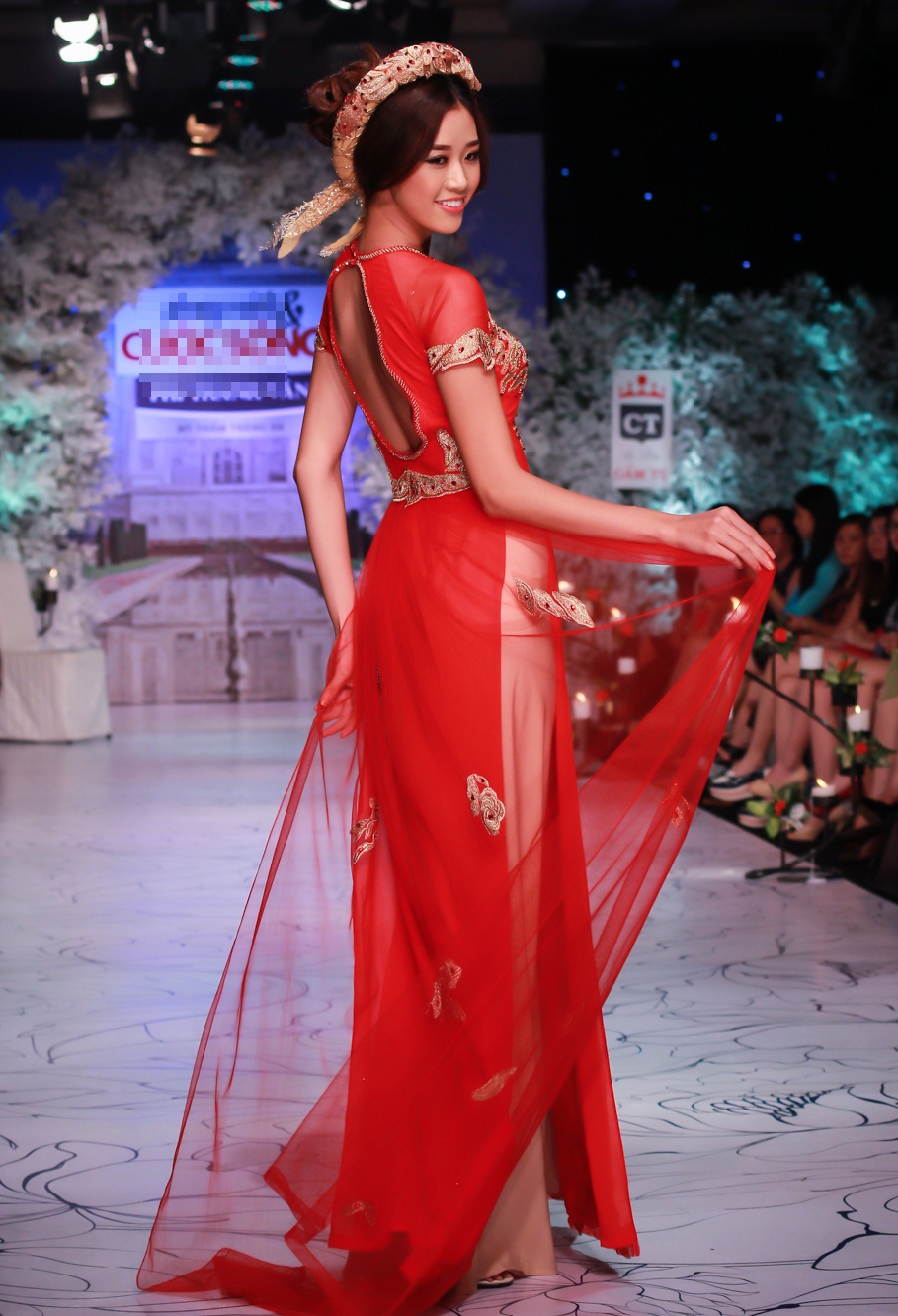 Diện áo dài cưới cách điệu bắt mắt, Khánh Vân nổi bật trên sàn diễn với phong cách tự tin, quyến rũ.