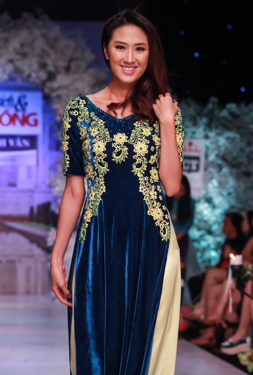 | Bộ sưu tập áo dài cưới của Cẩm Tú chú trọng chất liệu nhung the, phối voan mỏng thanh lịch và quý phái. Điểm nhấn hoạ tiết hoa truyền thống thêu kỳ công. Trong ảnh, người mẫu Trâm Anh trình diễn bộ áo dài màu xanh nhung. |