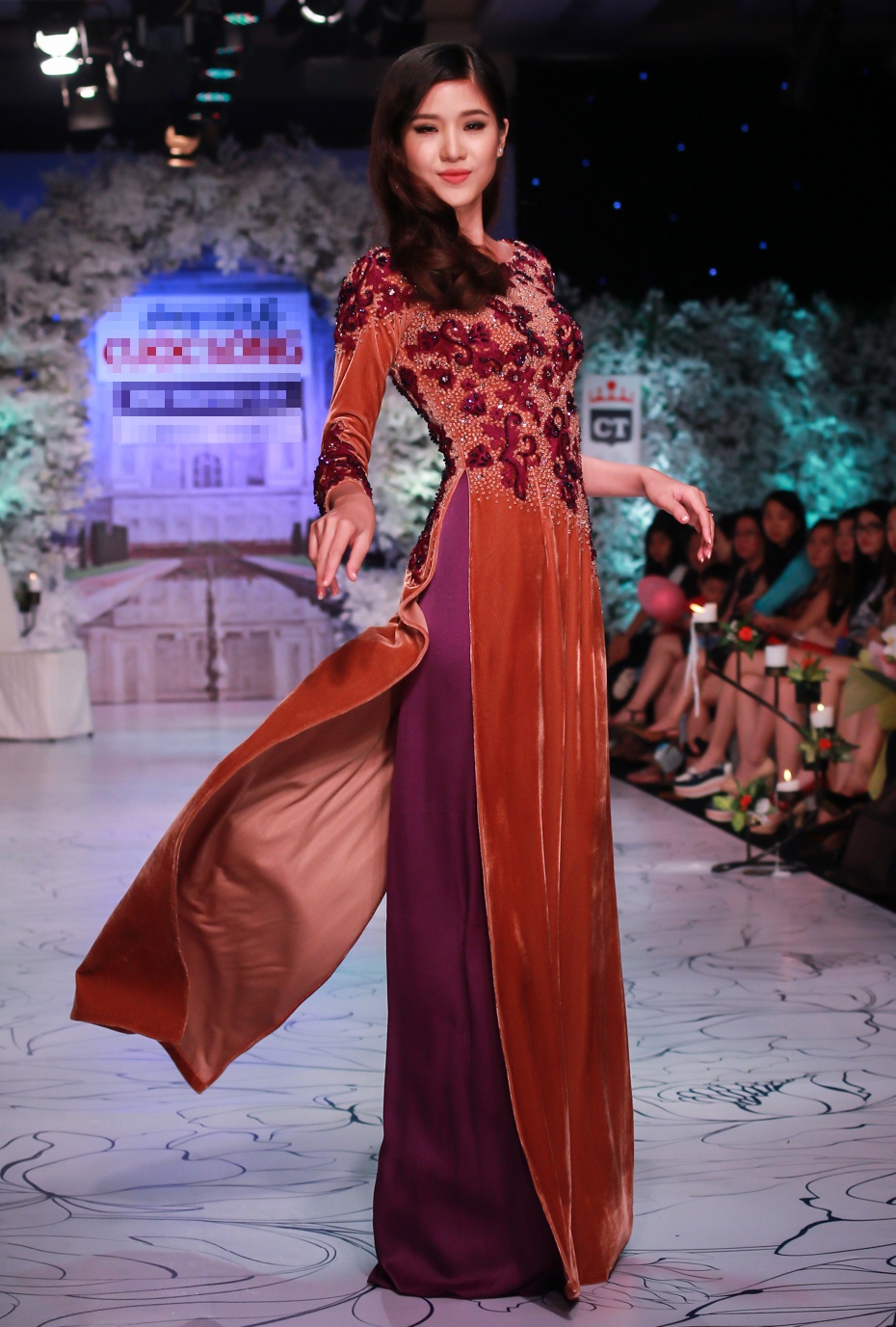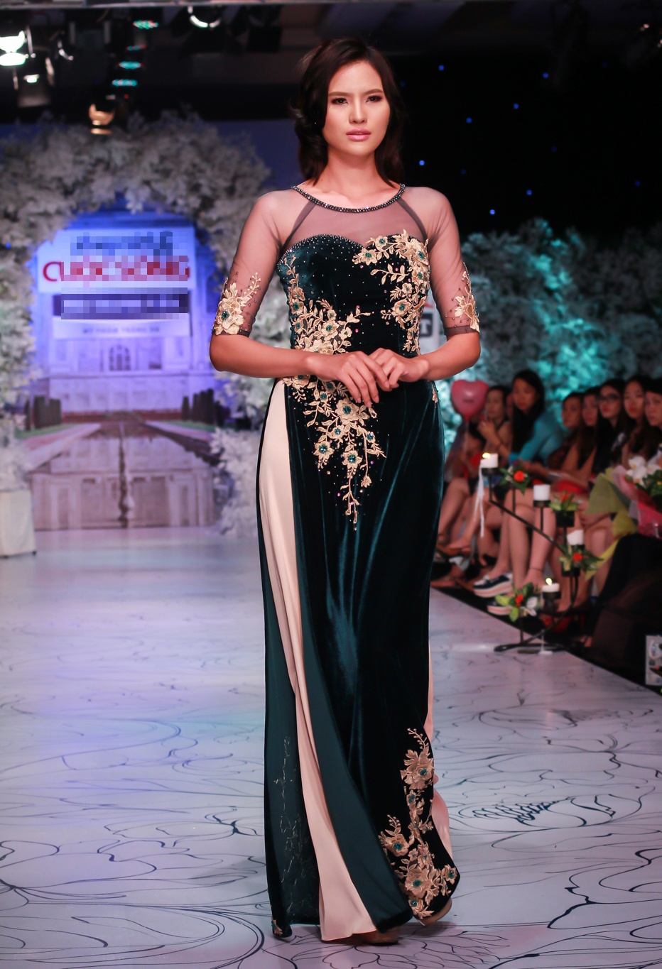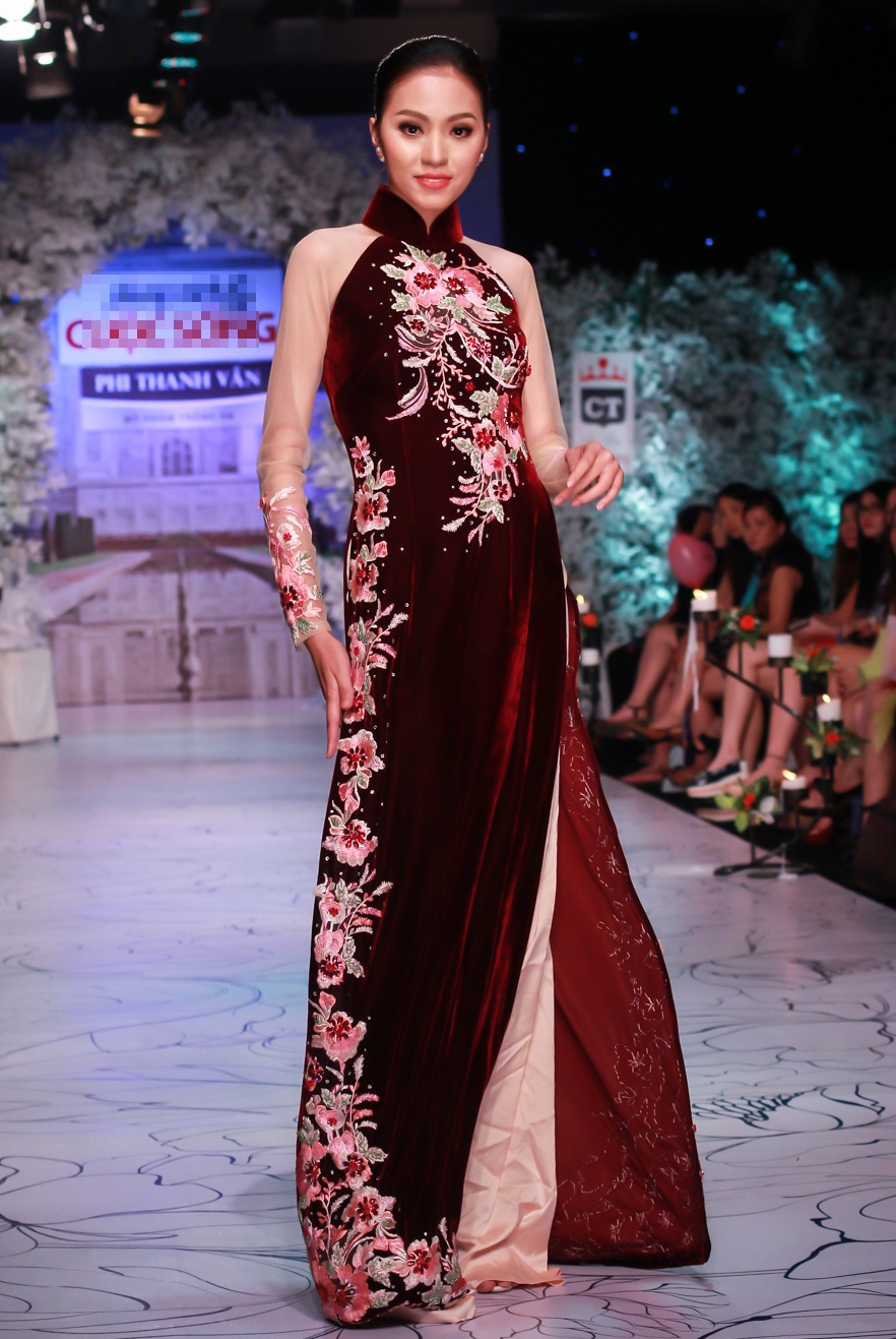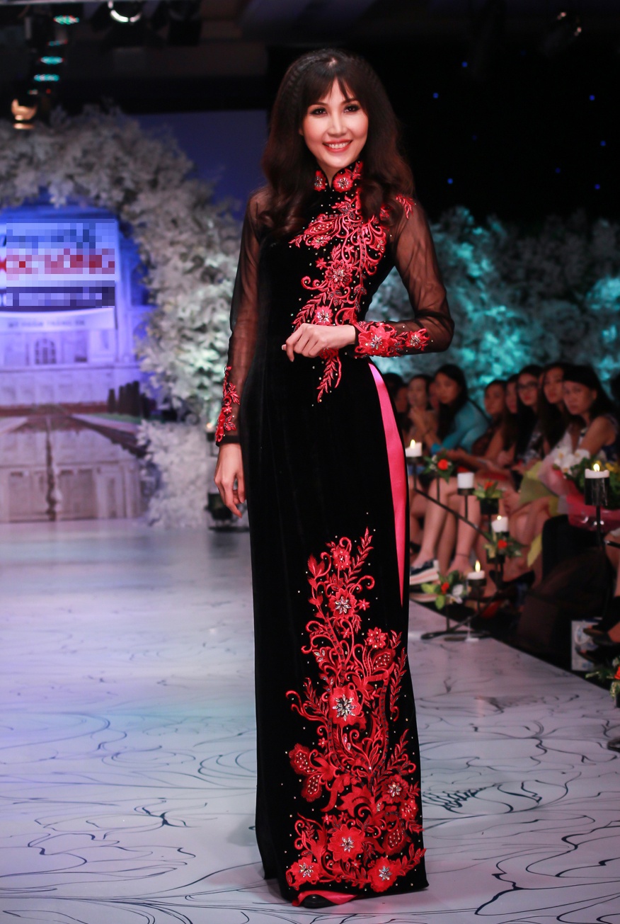 | Áo dài nhung đen làm nổi bật những đoá hoa cách điệu và thêu tỉ mỉ.
