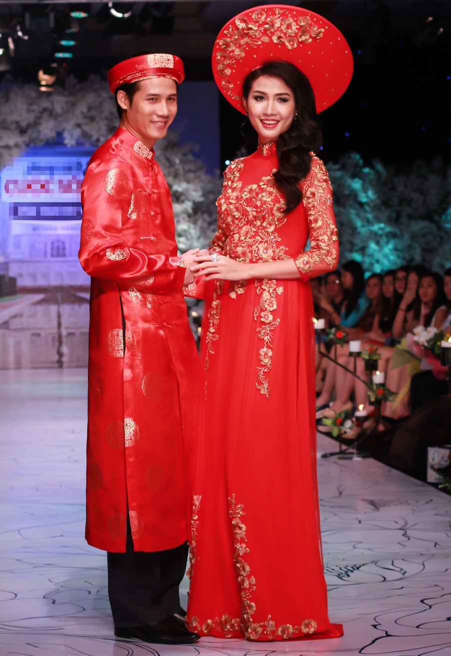 | Thanh Thức và Phan Thị Mơ mặc ton sur ton gam đỏ làm cô dâu, chú rể trên sàn diễn. |