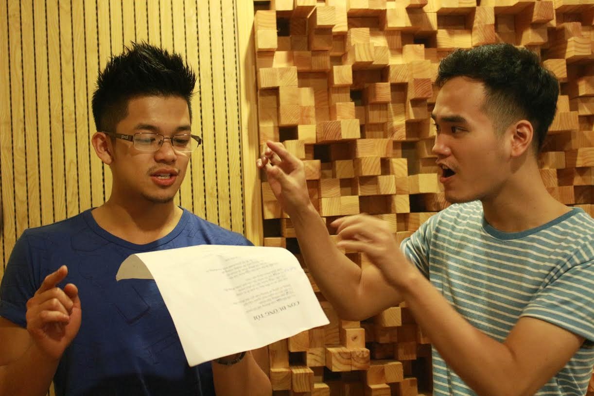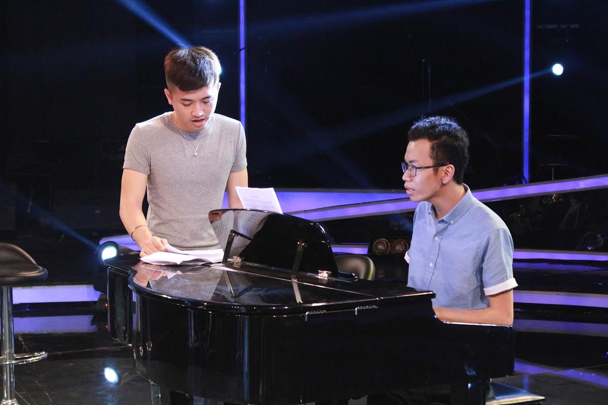 | Khắc Hưng nhiệt tình hướng dẫn Trọng Hiếu xử lý ca khúc mới. |