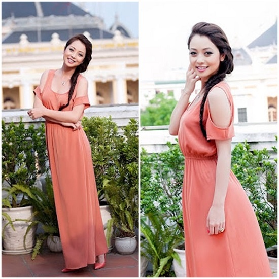 Nhẹ nhàng, đơn giản với váy maxi cam dâu ngọt ngào cùng tóc tết nữ tính. |