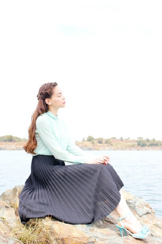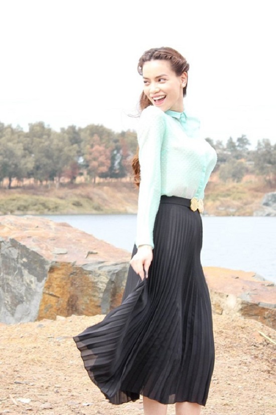 Biết được điểm yếu trên cơ thể là vòng 3 khiêm tốn, Hà Hồ đã hết sức thông minh khi mix chiếc sơ mi xanh bạc hà với chân váy midi xếp nếp ngoài giúp che khuyết điểm và làm bật lên nét đẹp thuần khiết đến không ngờ. |