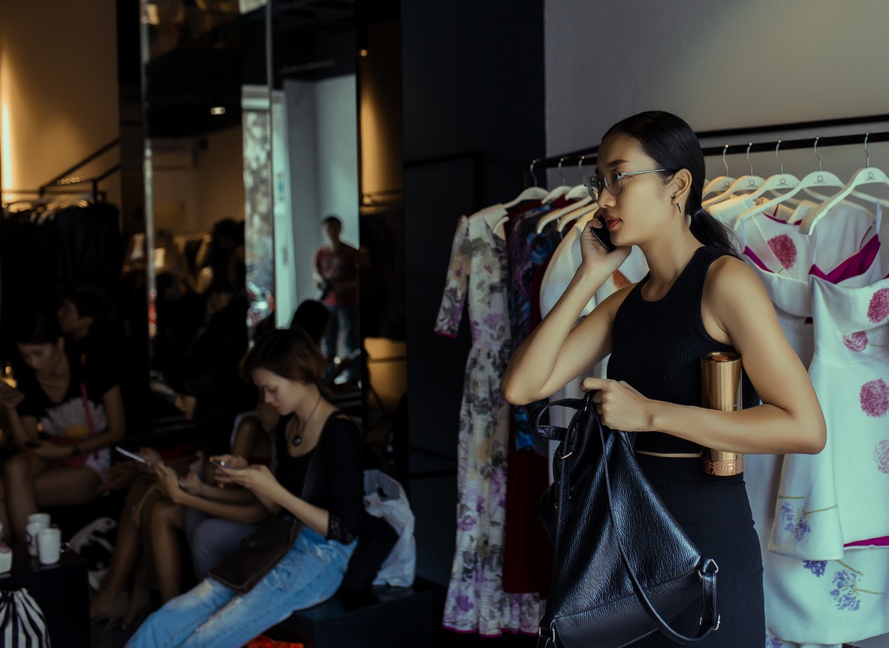 | Phía hậu trường buổi casting, các người mẫu chờ đợi lượt trình diễn của mình. Nhã Trúc bận rộn với các cuộc điện thoại sau khi hoàn thành lượt casting. |