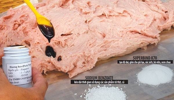 Thông tin tẩm hàng chục loại hóa chất vào thịt thiu để sản xuất chả lụa, nem, bò viên… bắt mắt, thơm ngon được chính chủ một số cơ sở làm nem, giò “tiết lộ”. Trong đó, muốn nem, chả lụa giòn, dai, người sản xuất cho K70, hỗn hợp Polyphosphate (E451, E452)… giá 130.000 đồng/bịch khoảng một kg. Còn để làm dậy mùi thịt nhập từ Mỹ và Singapore, người làm chỉ cần gia giảm chất Sodium benzoate và Pork pase NQ-446.