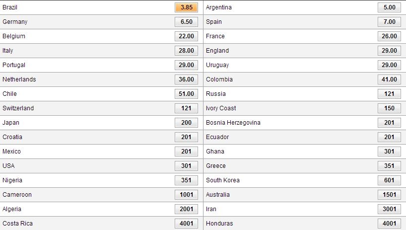 | Tỷ lệ nhà cái đưa ra cho khả năng vô địch của 32 đội bóng dự World Cup 2014. Dễ nhận thấy các ông lớn như Pháp, Italy, Anh, Bồ Đào Nha, Hà Lan đều không được đánh giá quá cao ở VCK lần này. |
