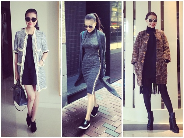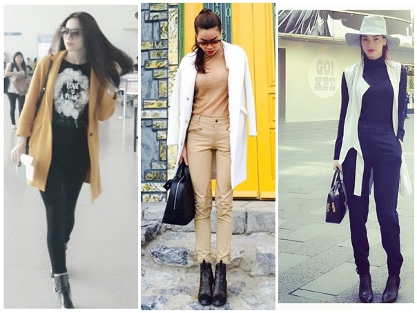 | Trang phục thu đông của Hà Hồ được mix theo gam màu. Đa phần đều là những tông đơn sắc, đường nét tối giản. Trong ảnh là những bộ cánh sử dụng lối mix hiện đại, thanh lịch. Người mặc trông bắt mắt hơn nhờ áo khoác bên ngoài. Bà mẹ một con chuộng mang boots cổ ngắn khi xuống phố. |