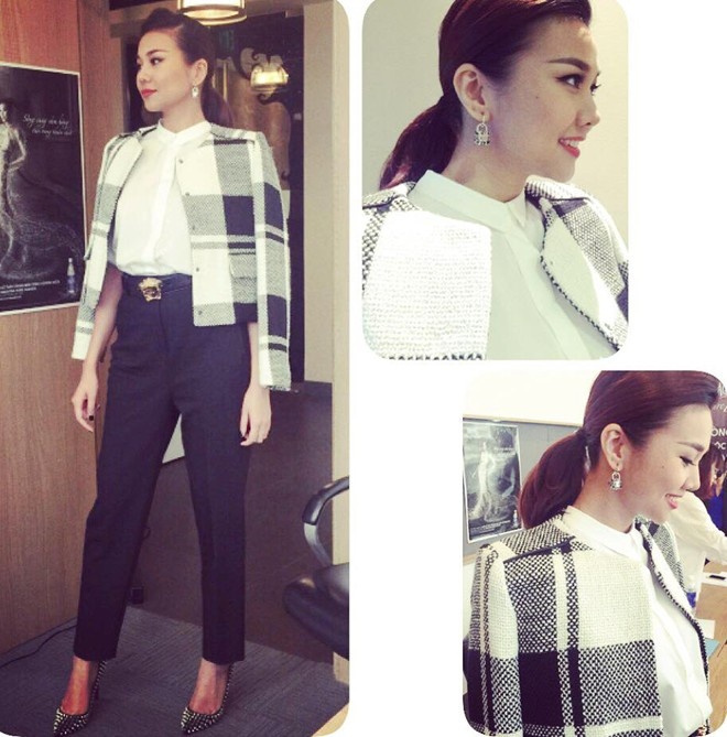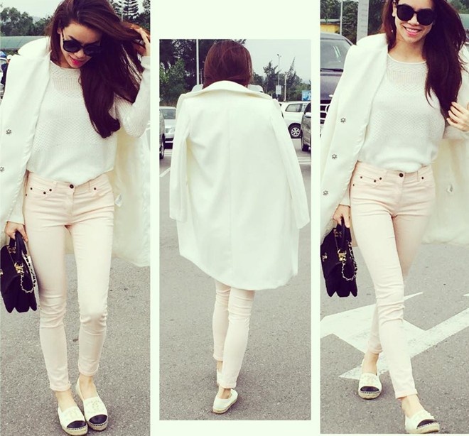 | Cô chuộng những gam màu trắng đen sang trọng. Set trang phục luôn có điểm nhấn phụ kiện bắt ánh nhìn. |