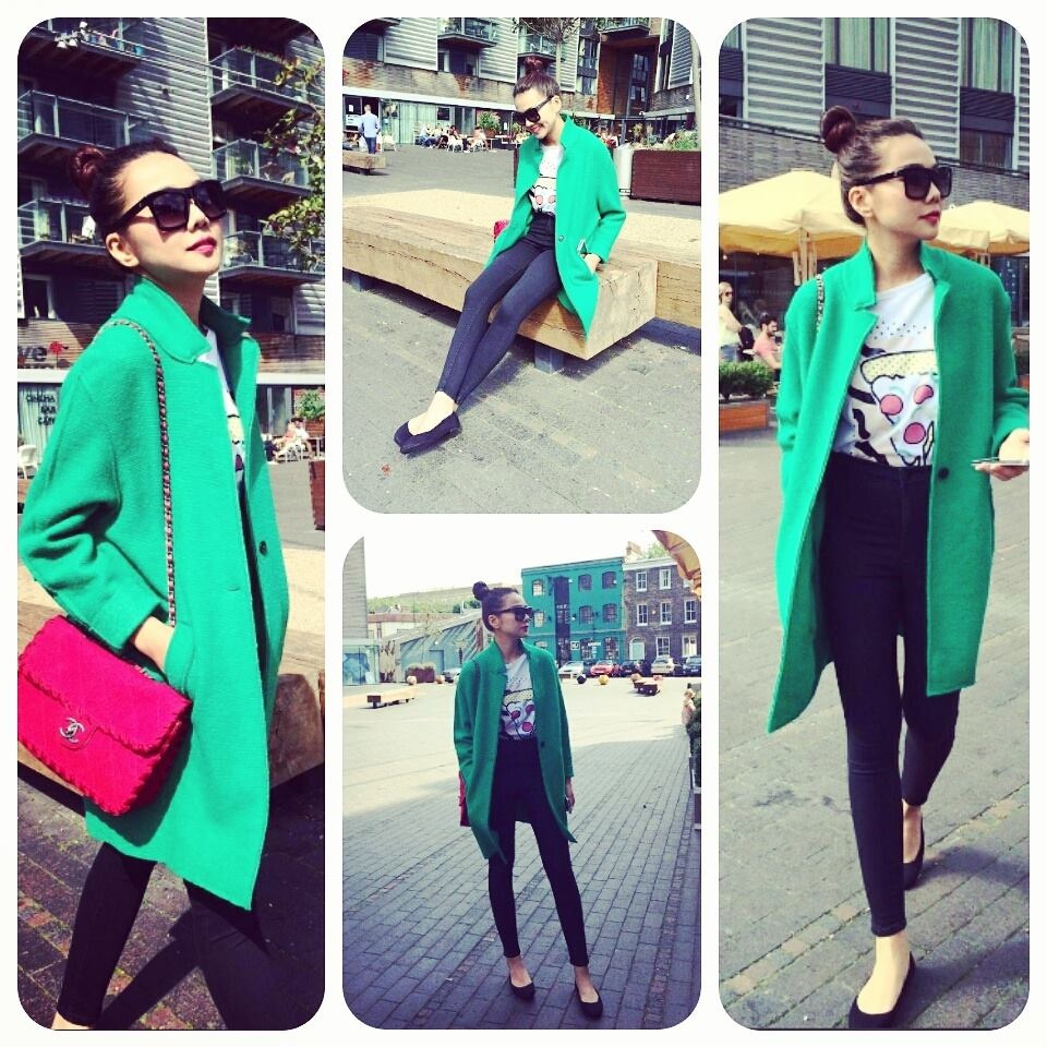 | Đôi khi người đẹp hướng đến nét trẻ trung bằng cách dùng những gam màu nóng, bắt mắt. Trong ảnh, chân dài thoải mái thả bộ trên phố với bộ cánh mix đơn giản - áo thun và leggings. Áo măng-tô gam màu xanh bên ngoài làm điểm nhấn nổi bật. |