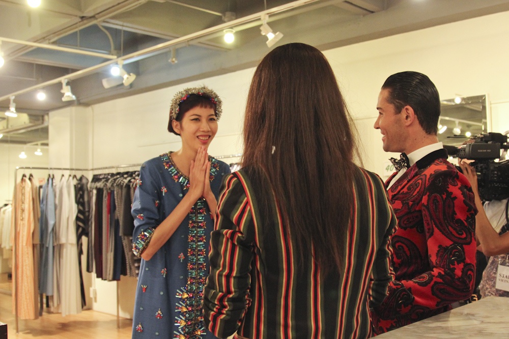 | Tiêu Ngọc Linh đươc yêu cầu vén cao tóc để nhà thiết kế nhìn rõ gương mặt. |