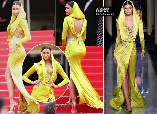 Siêu mẫu Irina Shayk khoe vẻ đẹp nóng bỏng, cuốn hút tại Liên hoan phim Cannes 2014 với một mẫu váy dạ hội haute couture độc đáo, ấn tượng của Atelier Versace.