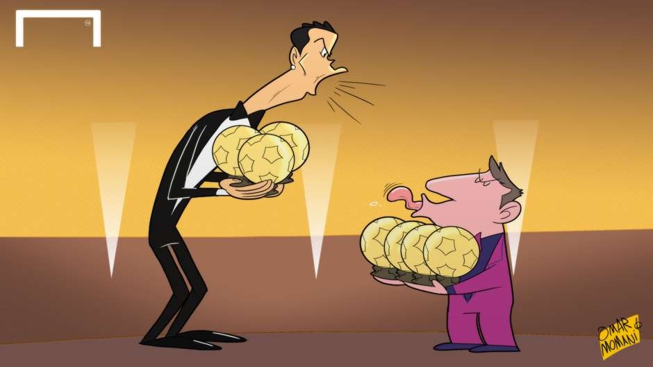 | Ronaldo hú lên sau khi giành 3 Quả bóng vàng. Tuy nhiên, thành tích của CR7 vẫn kém Lionel Messi. |