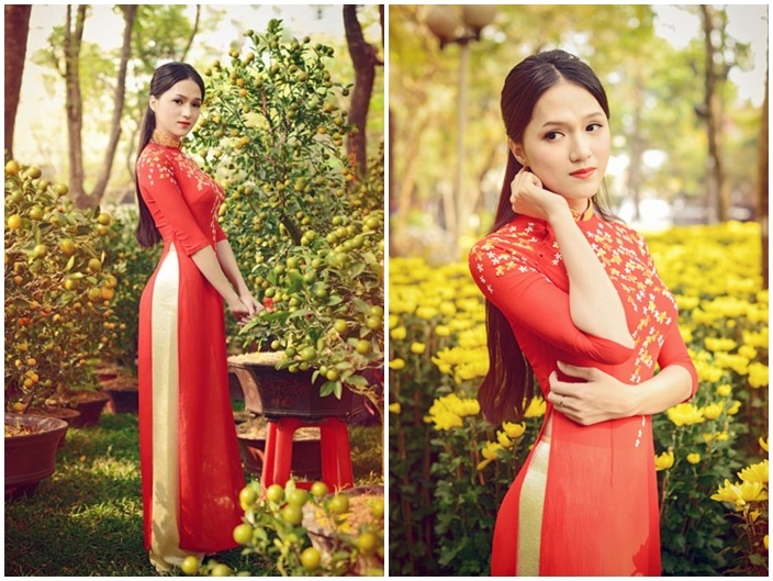 Hương Giang Idol chọn áo dài màu đỏ rực rỡ của NTK Thuận Việt khi dạo khu chợ hoa ngày Tết. Nữ ca sĩ chuyển giới chọn kiểu tóc rẽ ngôi giữa thanh lịch. Hình ảnh cổ điển, trang nhã giúp người đẹp nổi bật giữa muôn vàn sắc hoa xuân. Ảnh: Raymoon