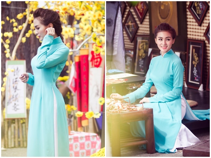 Được coi là mỹ nhân mặc áo dài đẹp nhất showbiz Việt, sau khi đoạt vương miện Hoa hậu Việt Nam 2012, Đặng Thu Thảo vẫn chọn áo dài là trang phục ưa thích, tôn vinh vẻ đẹp đậm nét truyền thống Việt mà cô may mắn có được. Lợi thế ngoại hình có số đo hoàn hảo 83-60-90, cùng chiều cao lý tưởng 1m73, hoa hậu dễ dàng phù hợp với nhiều dáng áo dài và sắc màu từ nổi bật đến nền nã. Tết 2014, Thu Thảo tiếp tục là biểu tượng người đẹp áo dài của showbiz Việt. Ảnh: Lê Thiện Viễn