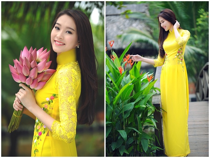 Ở bộ ảnh khác, Thu Thảo chọn áo dài có tông màu vàng rực rỡ của NTK Việt Hùng. Điểm nhấn tại hai bên eo rất dễ thương và duyên dáng, chất liệu ren tại tay áo thêm phần mềm mại và nữ tính.