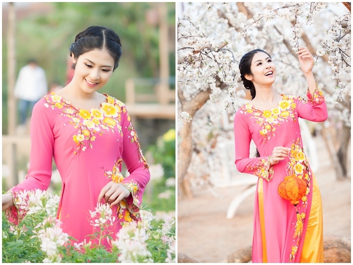 Hoa hậu Ngọc Hân kiều diễm trong mẫu áo dài tông màu hồng của NTK Thiên Vân. Mẫu áo có điểm nhấn nhá họa tiết hoa mai khá hài hòa. Hai tông màu hồng của áo, vàng của quần hòa quyện tạo nét nữ tính vốn có của phụ nữ Việt. Ảnh: Tân Đà Lạt
