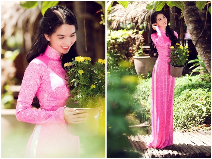 ''Nữ hoàng nội y'' bỗng trở nên ngọt ngào và nữ tính trong mẫu áo dài màu hồng, in họa tiết chìm, chất liệu lụa truyền thống của NTK Minh Châu. Mái tóc vấn nhẹ nhàng phù hợp trang phục giúp Ngọc Trinh đẹp hơn trong mắt người hâm mộ. Ảnh: Lê Thiện Viễn