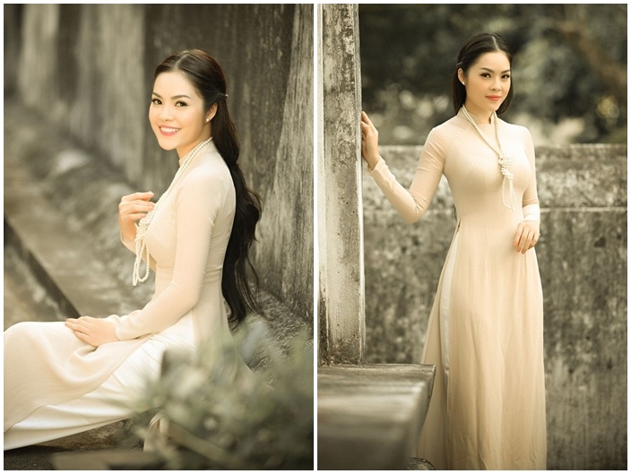 Lợi thế ngoại hình giúp Trà Ngọc Hằng dễ dàng thay đổi hình ảnh từ gợi cảm đển nữ tính, truyền thống. Mẫu áo dài cổ điển của NTK Nhật Dũng giúp cô xây dựng thành công hình tượng cổ điển, quý phái. Chất liệu lụa hoài cổ không kém phần sang trọng đưa người đẹp gợi cảm trở thành mỹ nhân duyên dáng khi bước sang thềm năm mới. Ảnh:Luke Nguyễn